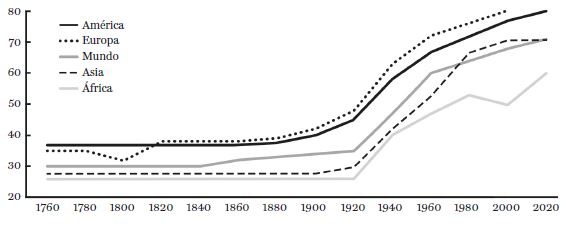 ¡El gráfico 2.3 es bastante impactante! La esperanza de vida no para de aumentar en todo el mundo. Fíjate en este dato: una persona que haya nacido este año tendrá tres meses más de esperanza de vida que alguien nacido en 2019. Al principio de mi carrera, cuando mis clientes de avanzada edad se enfrentaban a graves problemas de salud, solían solicitar información sobre centros de cuidados paliativos o sobre los precios de los cuidados médicos en la etapa final de la vida. Hoy en día, estas personas quieren mantenerse con vida el mayor tiempo posible y buscan rápidamente tratamientos experimentales o los últimos avances de la medicina a escala global. Saben que cuanto más tiempo permanezcan vivos, más posibilidades habrá de que aparezca alguna innovación capaz de tratar su condición médica.