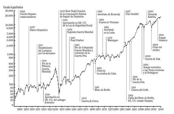 En el canal del tiempo no hay nada que logre más espectadores que la cobertura informativa de un huracán o un tornado. Pero la mayor parte del tiempo, la información meteorológica es bastante aburrida. Parcialmente soleado, 30 por ciento de probabilidad de lluvia, posibilidad de tormentas. Estos titulares no atraen espectadores. De igual modo, en el mundo de las noticias financieras hay muchas ocasiones en las que no hay mucho de lo que informar. El mercado sube, el mercado baja, las empresas salen a bolsa con una oferta pública inicial. En realidad no es algo revolucionario. Para hacer que las cosas parezcan más interesantes, a menudo los medios de comunicación convierten un hecho habitual, como una caída puntual de la bolsa, en un relato sobre una crisis financiera. Pero esto suele tener poco o ningún efecto sobre la evolución del mercado a largo plazo, razón por la cual el gráfico 2.6 es uno de mis favoritos. De forma muy acertada se titula «La innovación humana siempre triunfa sobre el miedo». Notarás que en el gráfico apenas hay espacio suficiente para incluir todos los «titulares de crisis» que han salido a la luz desde 1896. ¿Y qué hace el mercado? Ignorarlos. Y seguir registrando nuevos máximos, premiando así a los inversores que operan a largo plazo.
