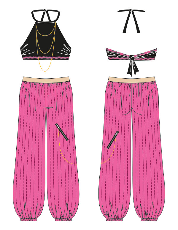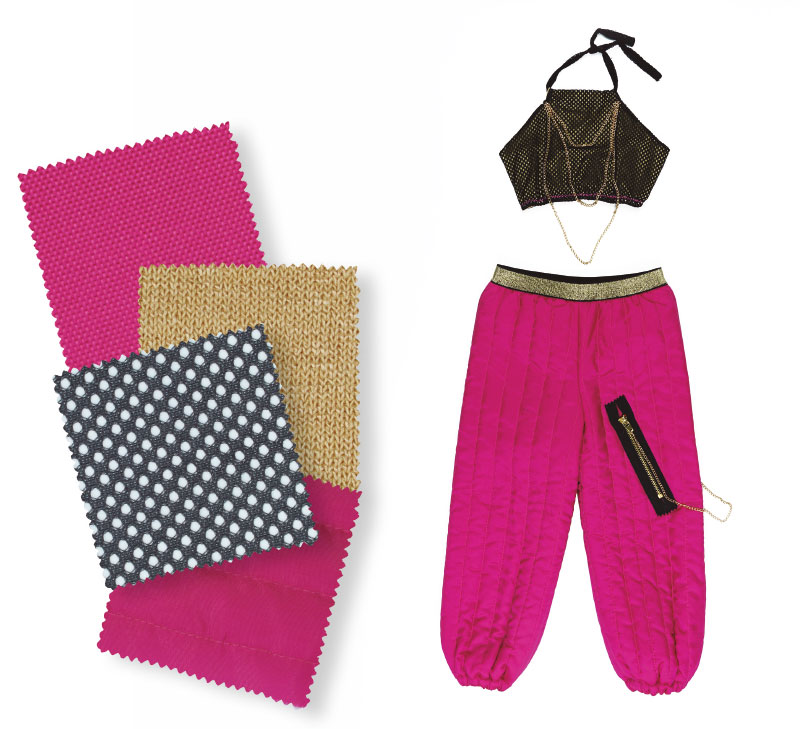 Aunque para el modelo hemos empleado un tejido de red para el top y uno acolchado para el pantalón, puedes utilizar para el primero uno 3D o con calados que tenga algo de elasticidad para que se adapte al cuerpo. Y para el pantalón tejidos de peso medio como denim, sargas, crepé de poliéster, incluso jacquard, terciopelo o pana.