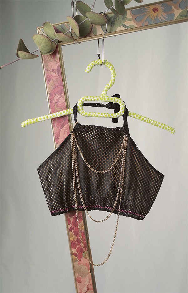 ▶ Por último, sujeta las cadenas de adorno con un punto a mano en ambos extremos del túnel del escote.