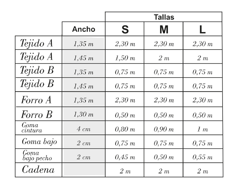 Consulta la tabla de consumos para saber cuánta cinta de goma y de cadena vas a tener que usar.