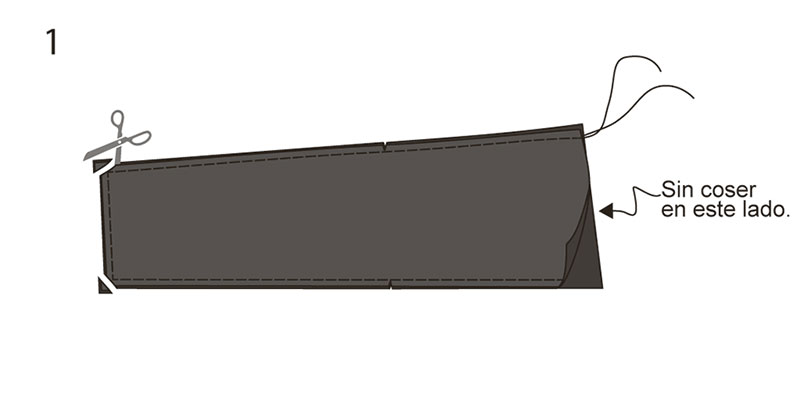 Coloca las piezas del lazo de la espalda, una sobre otra, con los derechos encarados y únelas con un pespunte por tres de sus lados, dejado sin coser el que se unirá al delantero. Corta en las esquinas para que queden definidas al voltear la pieza. Plancha las costuras por el derecho después de voltearla.