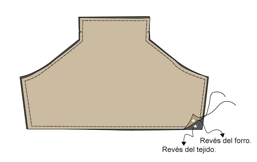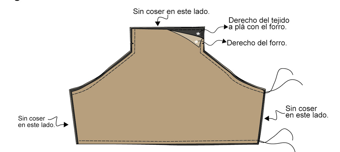 ▶ Coloca sobre el delantero la otra pieza de forro, con los derechos encarados. Une ambas con un pespunte por las sisas y el bajo. Deja el escote y los costados sin unir.
