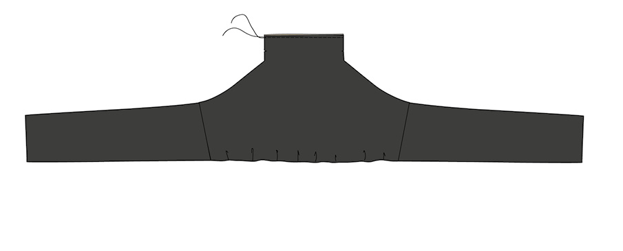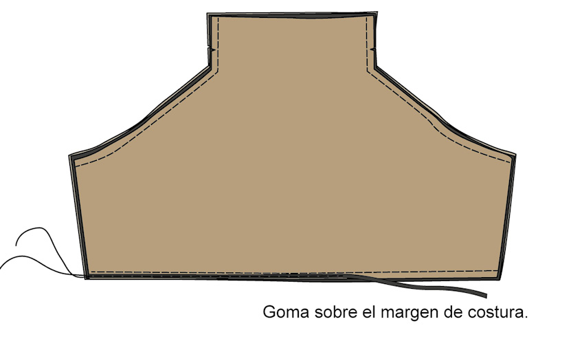 ▶ Cose una goma en el bajo del delantero, sobre el margen de costura del lado del forro. Asegúrate de que el tamaño de la goma es menor que la costura sobre la que va a ser aplicada, ya que al coserla hay que estirarla ligeramente para obtener el efecto deseado. El top tiene que ceñirse ligeramente al cuerpo.