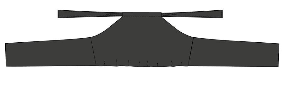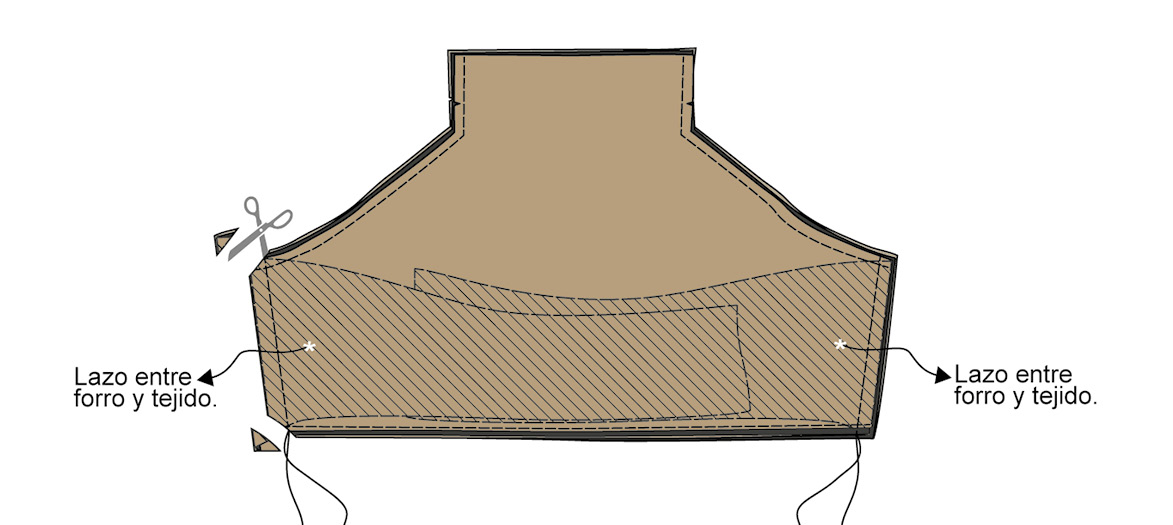 ▶ Introduce las piezas de los lazos de la espalda entre el forro y el tejido en cada uno de los costados de la pieza del delantero. Únelos con un pespunte cerrando al mismo tiempo los costados. Corta las esquinas en sesgo para que queden definidas al voltear la pieza. Voltea por el escote.