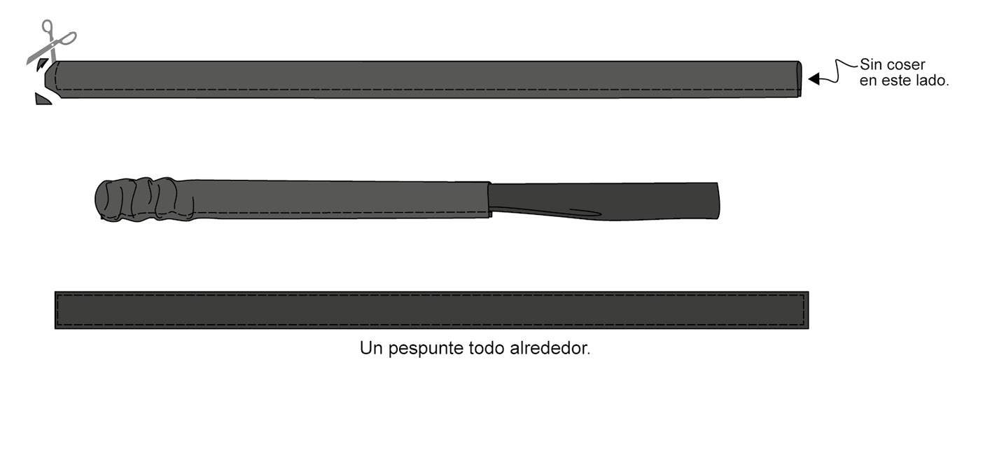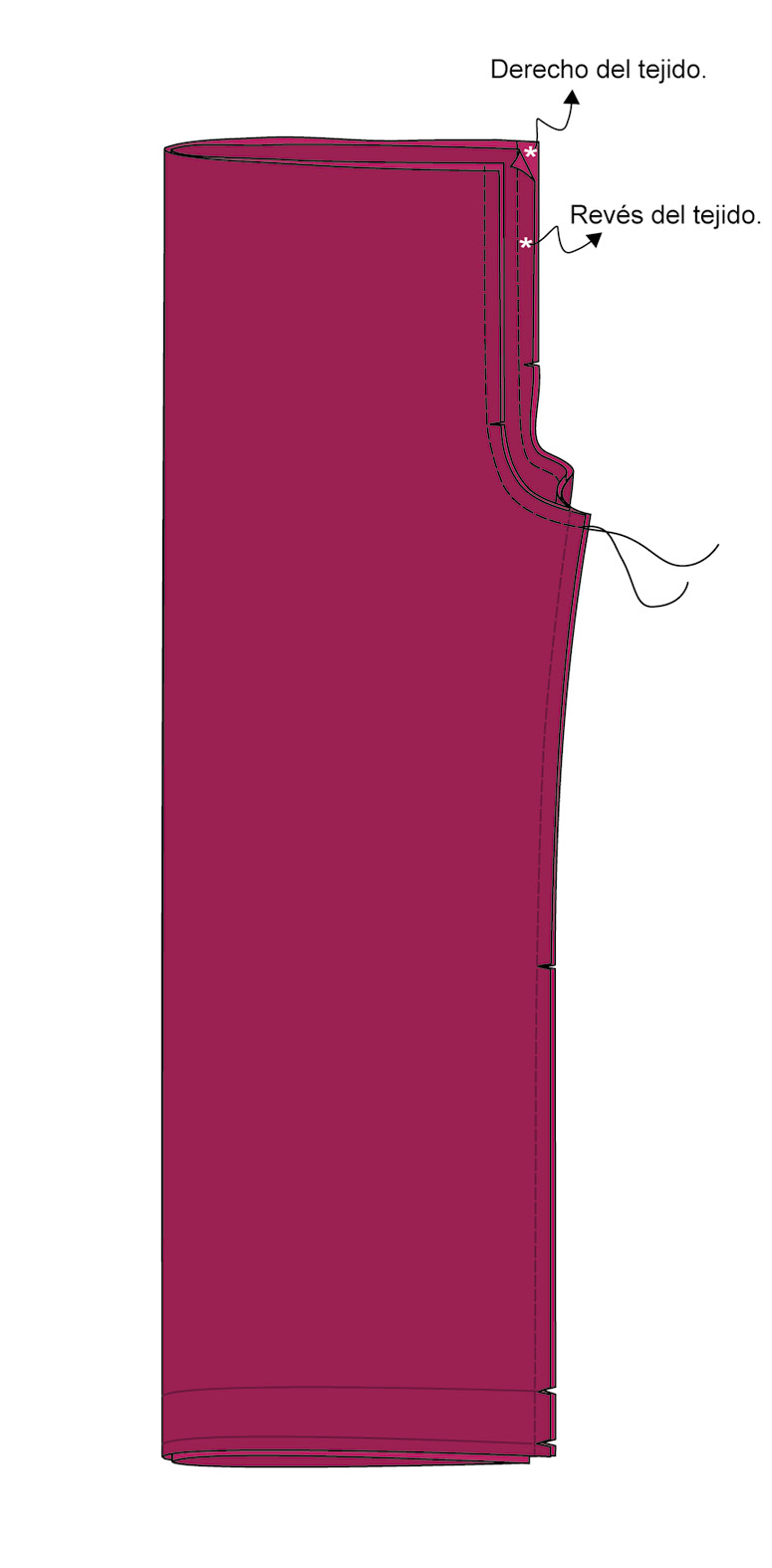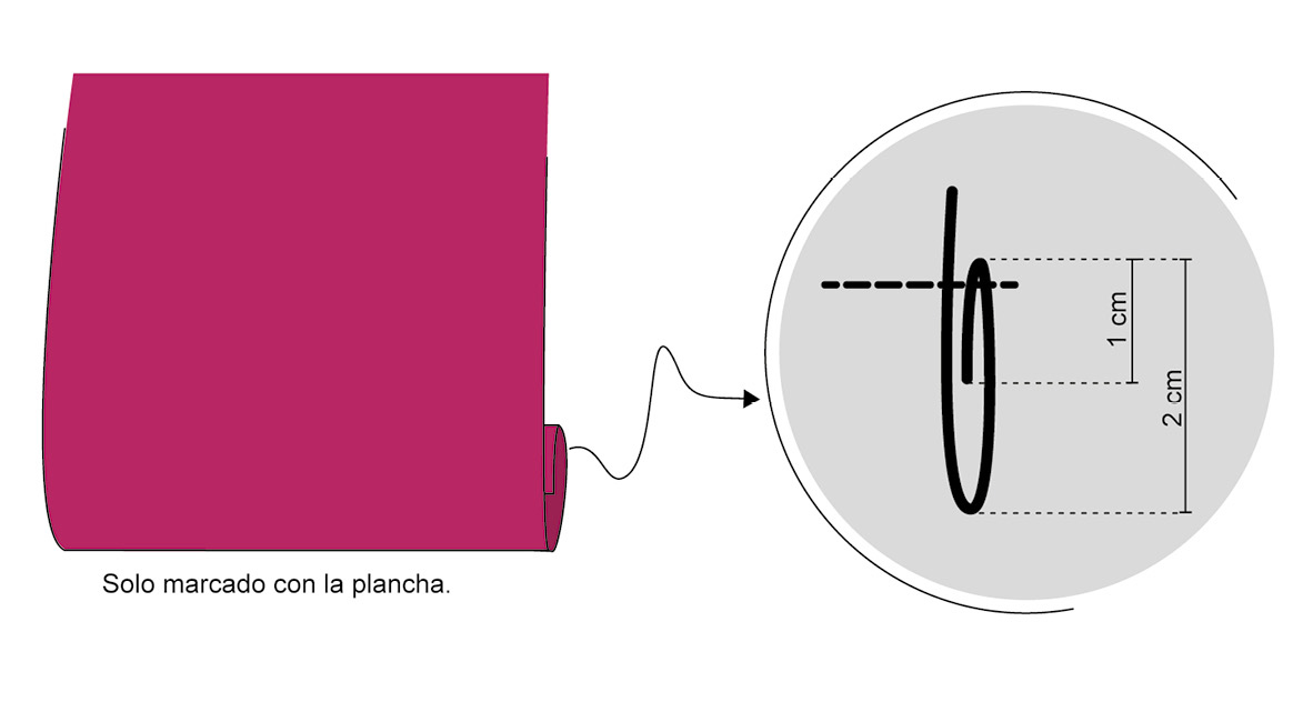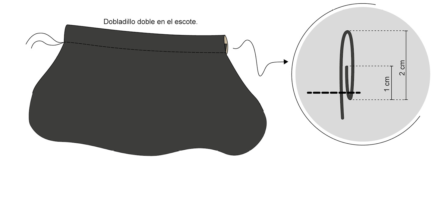 ▶ El túnel es un dobladillo doble en el que primero se dobla con la plancha o con un hilván 1 cm del canto y luego se vuelve a doblar 2 cm para que el lazo pueda pasar y moverse fácilmente. Este dobladillo se sujeta con un pespunte que se da por el revés cerca del primer doblez.