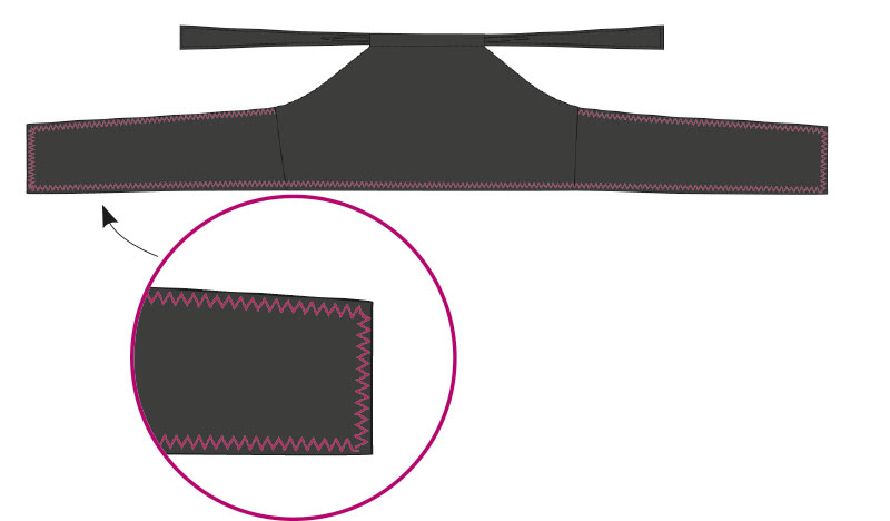 ▶ Une el tejido y el forro en el escote con un pespunte sobre el margen de costura para evitar que se muevan mientras confeccionas el túnel para que pase el lazo que se ciñe al cuello.