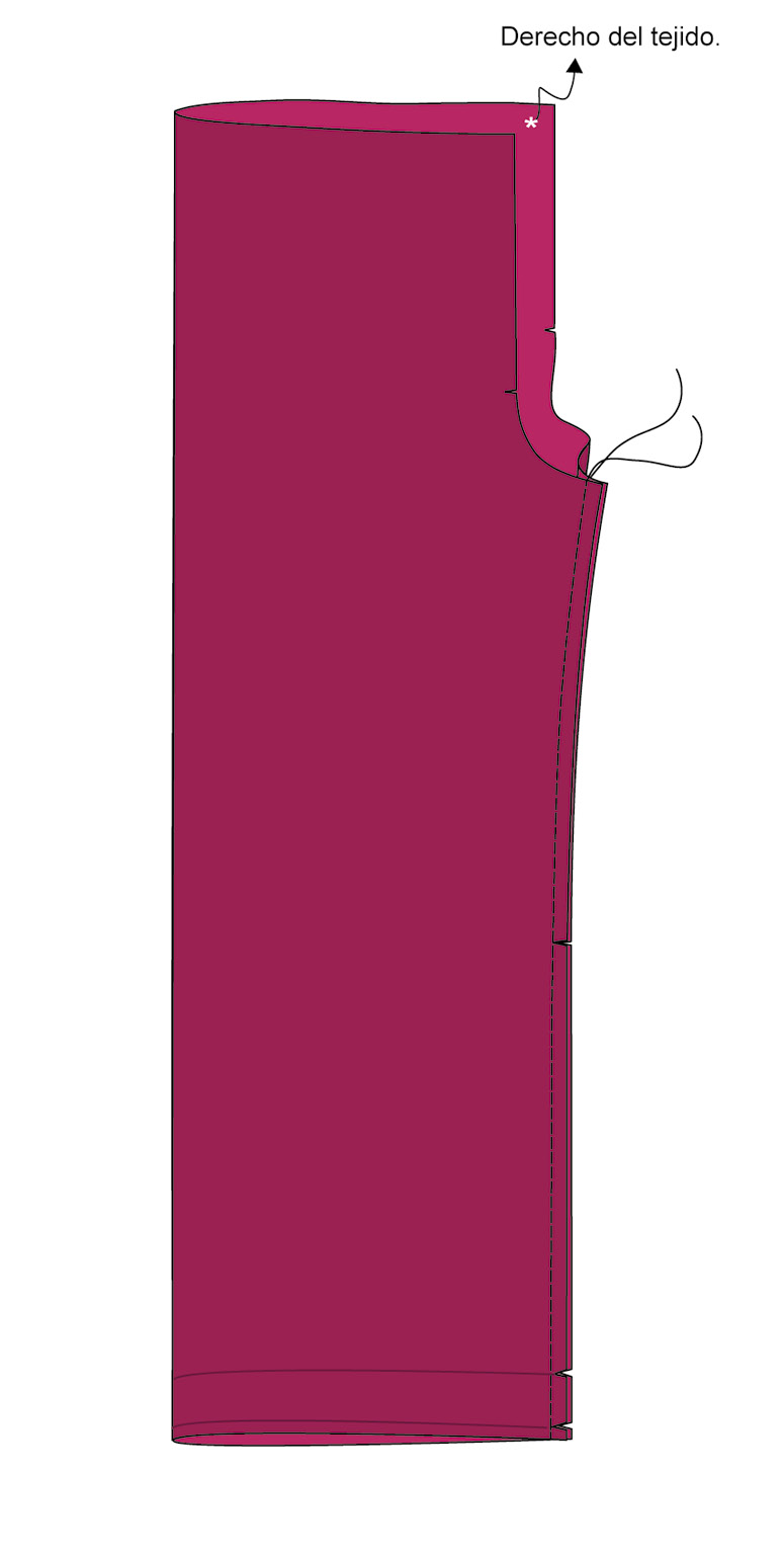 ▶ Dobla la pernera del pantalón encarnado el derecho. Haz coincidir los piquetes de los márgenes de costura de cada uno de los lados, y cose con un pespunte. Remalla o sobrehíla la costura y luego plánchala.