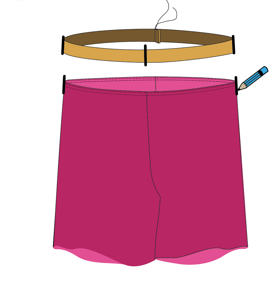 ▶ Haz una marca en la cinturilla del pantalón que indique el doblez del costado de cada pernera. Corta la goma de la cinturilla con la medida de tu cintura menos 3 cm y dóblala en cuatro partes iguales.
