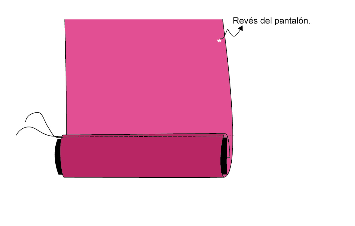 ▶ Vuelve a marcar con la plancha el dobladillo doble del bajo del pantalón. Introduce la goma dentro del dobladillo antes de cerrarlo con un pespunte al borde dado por el revés de la pernera.