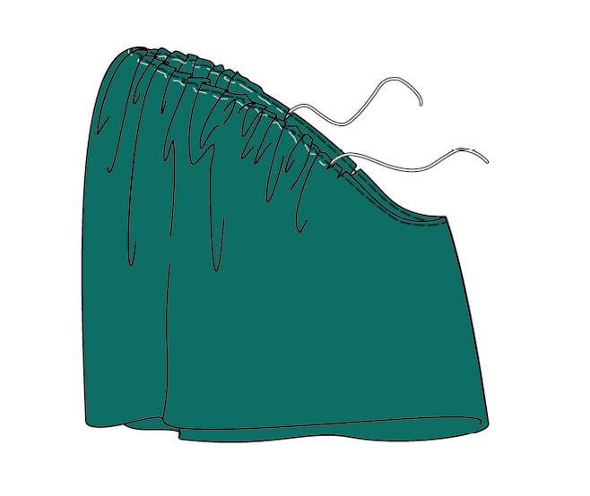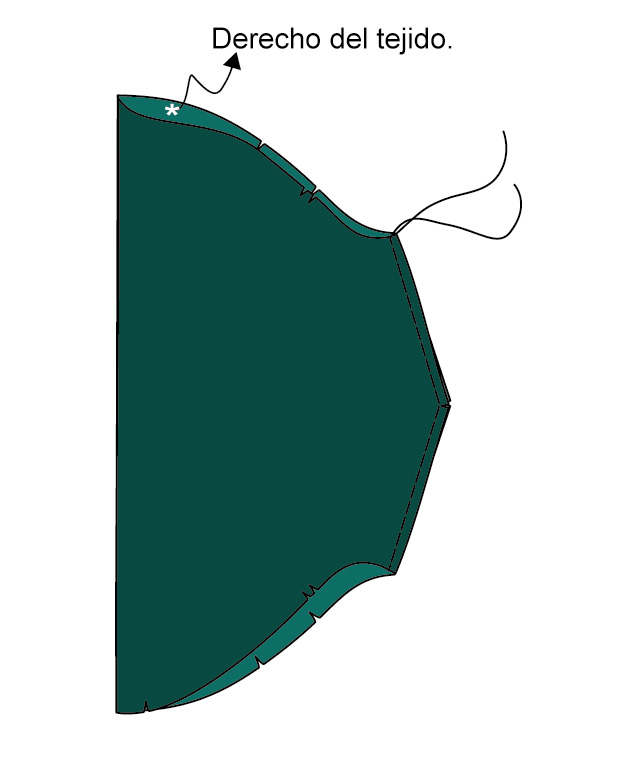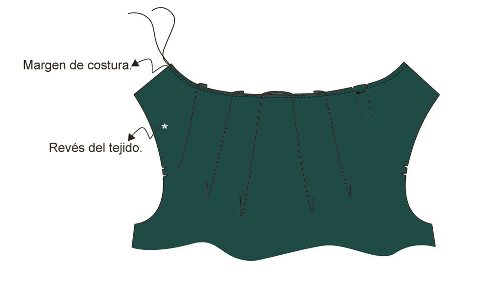 ▶ Con un hilván corto o con una puntada a máquina larga y floja, frunce la corona desde el doble piquete delantero hasta el piquete de la espalda.