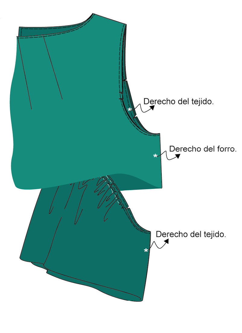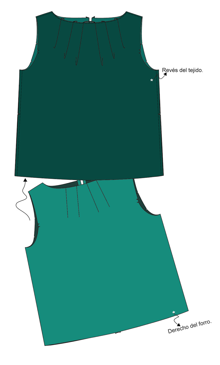 ▶ Une el delantero y la espalda por los hombros y los costados, encarando derecho con derecho. Realiza esta operación con las piezas de tejido principal y con las de forro. Plancha las costuras abiertas.