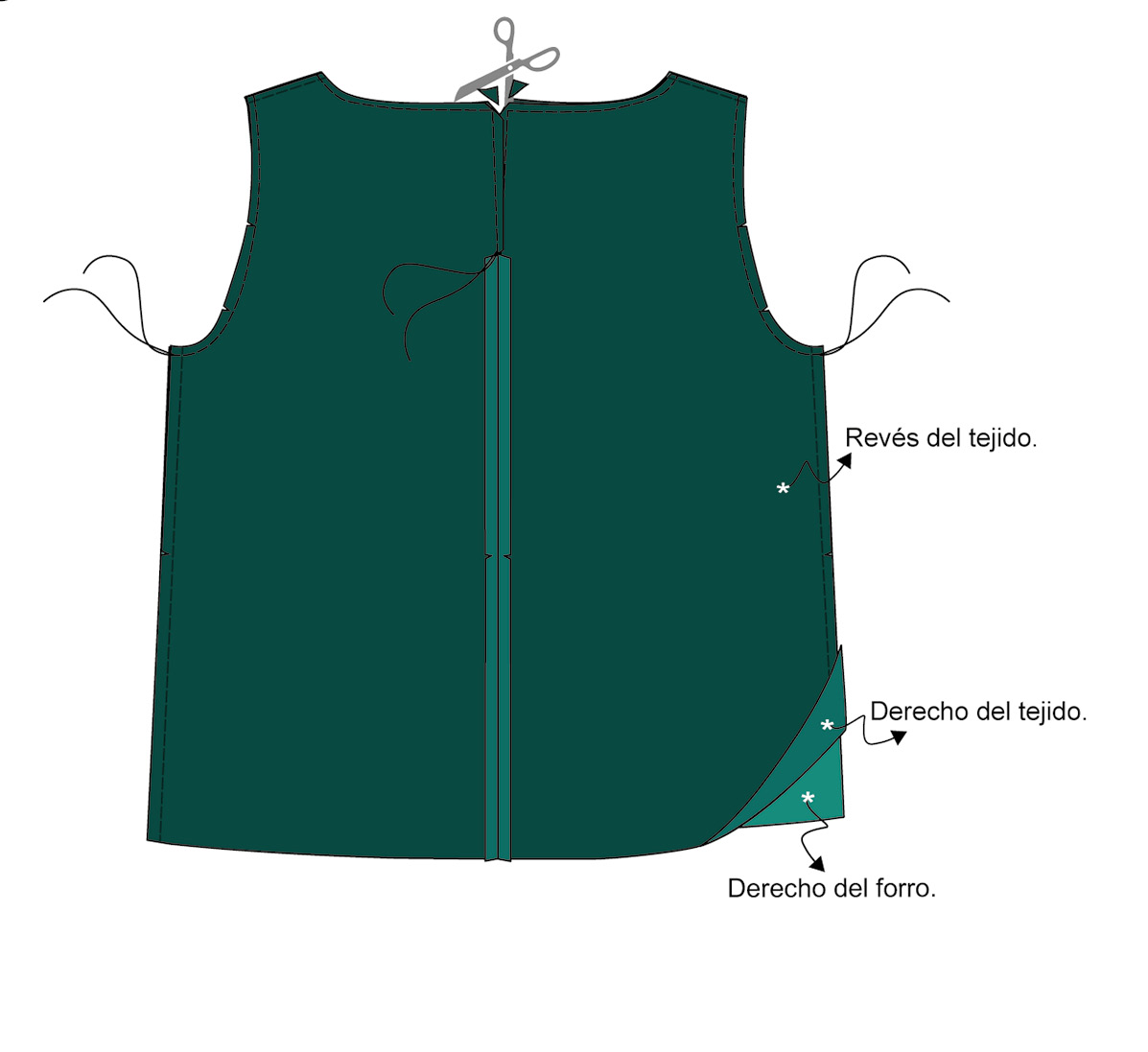 ▶ Asegúrate de que la costura que remata la abertura de la espalda coincide con la costura del centro de la espalda. Corta en sesgo las esquinas de la abertura con el escote para que al voltear las piezas estas queden más definidas.