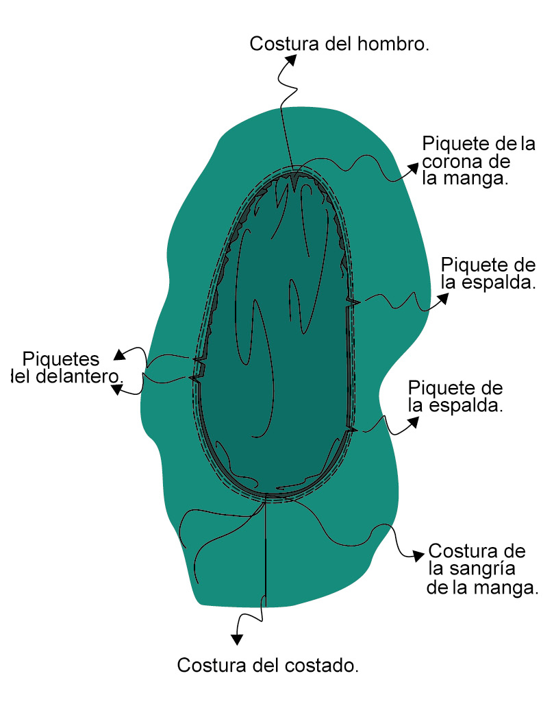 Remalla o sobrehíla el canto de las piezas en la costura del centro de la espalda, en los costados y en los hombros, tanto en el tejido principal como en el forro.