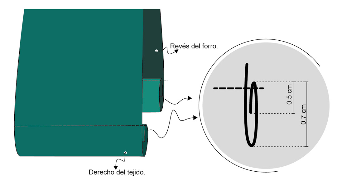 ▶ Remata el bajo del cuerpo exterior y el de forro con un dobladillo doble de 0,7 cm sujeto con un pespunte. El dobladillo del tejido debe doblarse hacia el revés del mismo al igual que el dobladillo del forro, de tal forma que ambos queden encarados entre el tejido y el forro.