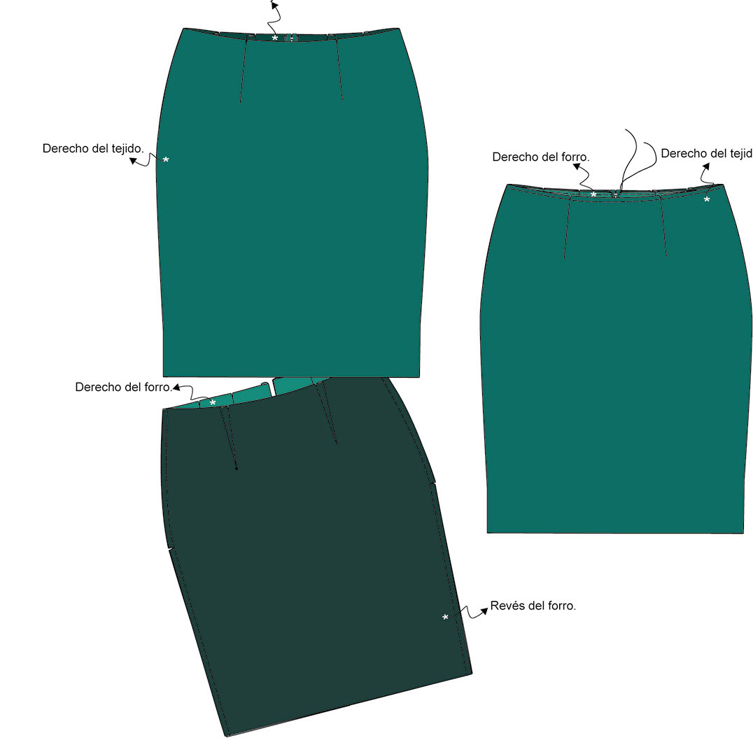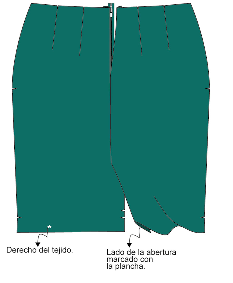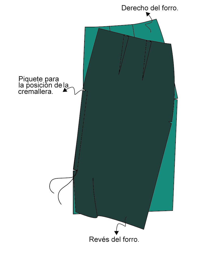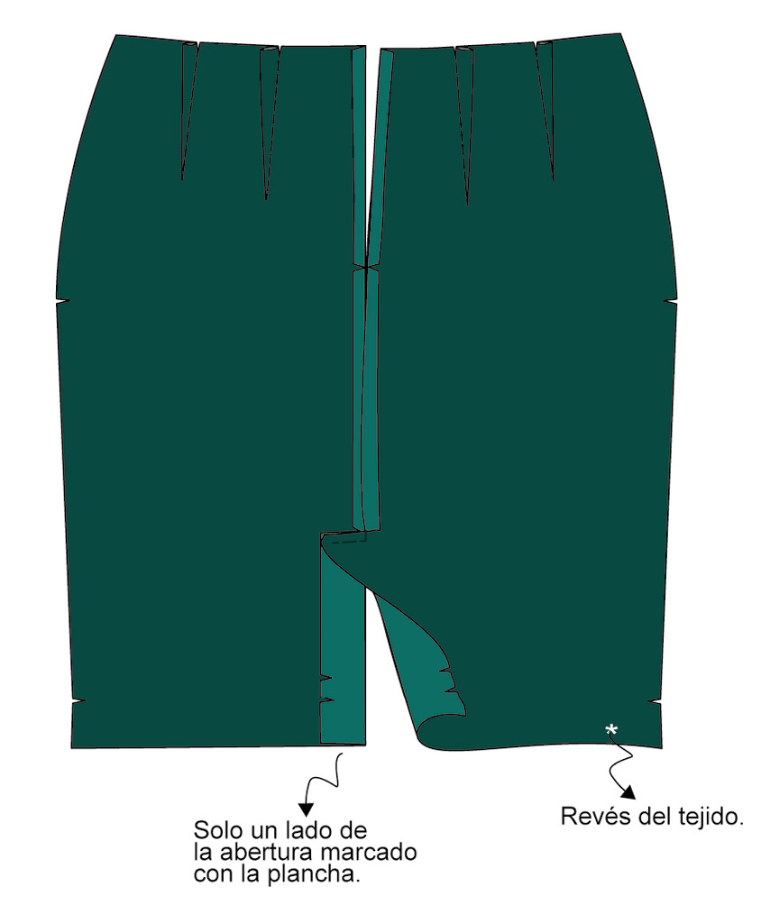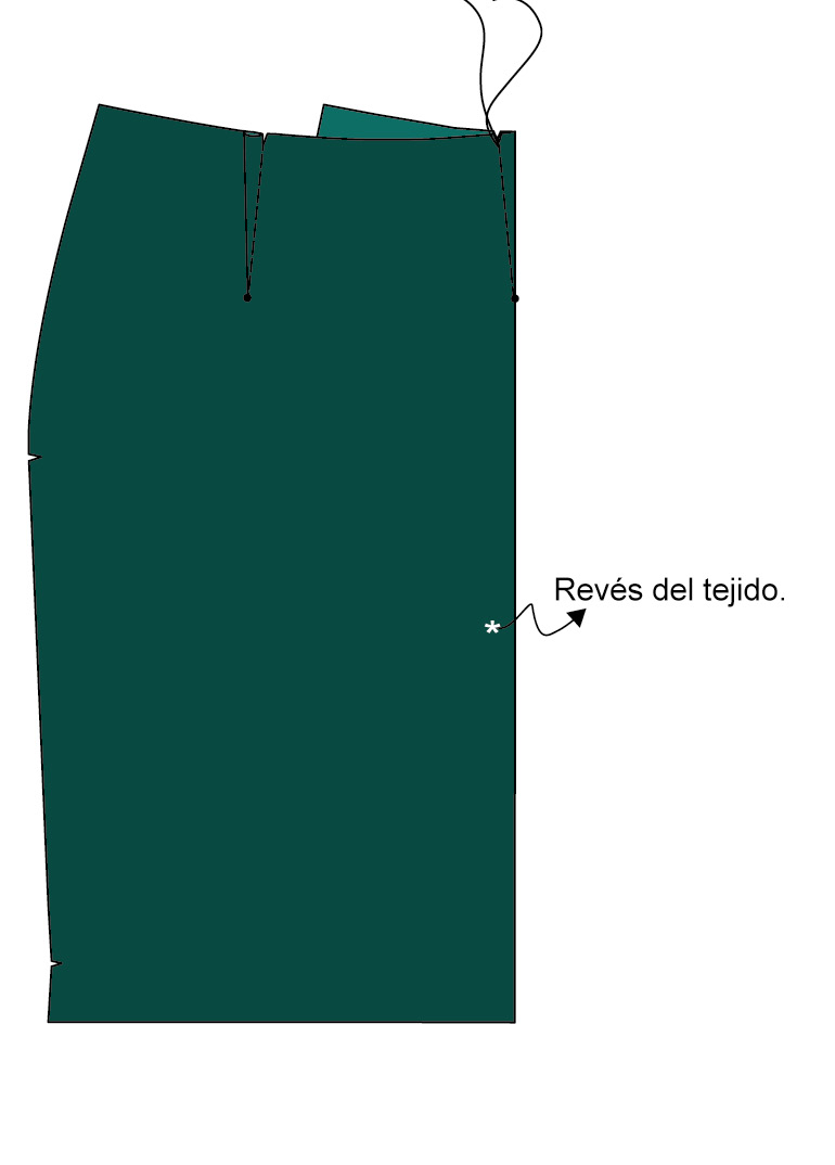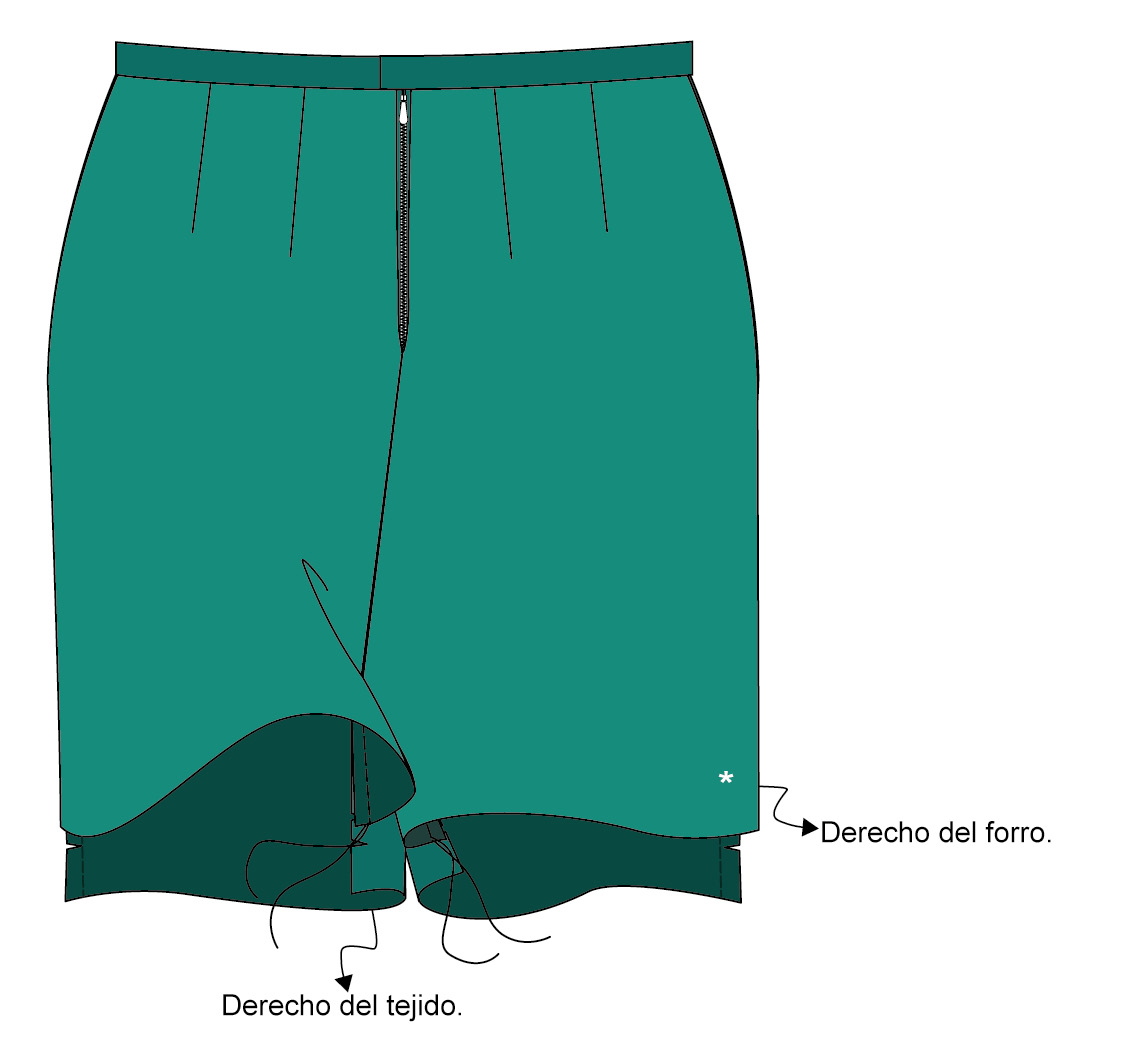 ▶ Para realizar la abertura, voltea el tejido y el forro de la falda para encarar los derechos. Haz coincidir los cantos de la abertura del tejido con la del forro —número 5 en el patrón— y únelos con un pespunte. Voltea y plancha la abertura por el derecho.