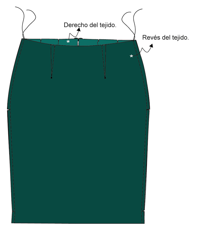 ▶ Pega la entretela a la cinturilla, dobla la mitad con la ayuda de la plancha. Coloca la cinturilla sobre la falda con los derechos encarados, haciendo coincidir los piquetes con las costuras de los costados y los centros.