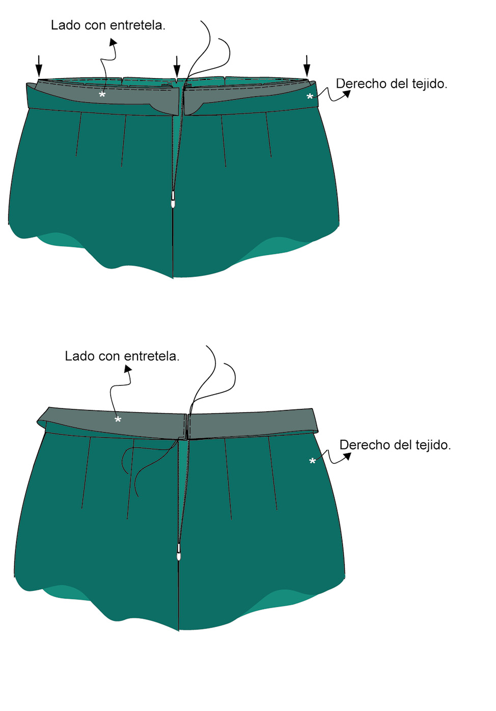 Cose la cinturilla a la falda con un pespunte. Dobla la cinturilla a la mitad, con el derecho encarado, une con un pespunte los bordes de la cinturilla y el martillo donde irá el botón.