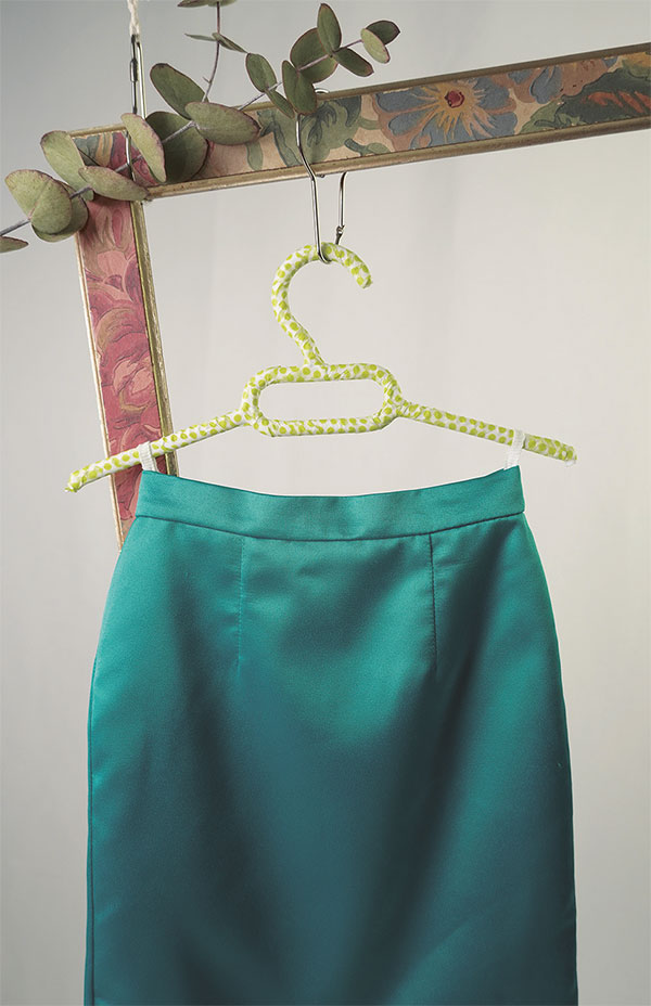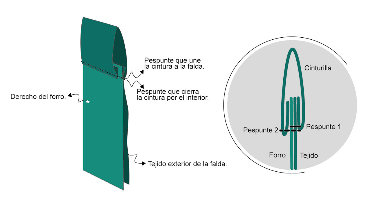 ▶ Cierra la cinturilla por el interior de la falda doblando el margen de costura hacia el interior de la cinturilla con la plancha o con un hilván. Cósela a mano con un punto invisible o a máquina dando un pespunte por el derecho, sobre la costura de la aplicación de la cinturilla, de tal forma que es el pespunte sujete la parte interior de la cinturilla.