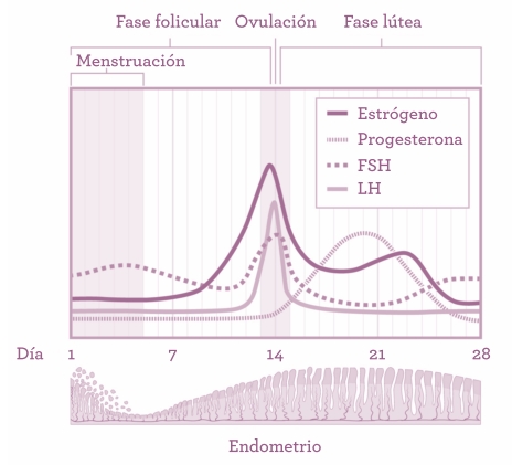 • ESTRADIOL: el término técnico es 17-beta estradiol, pero se la conoce por estradiol sin más. Es el estrógeno principal antes de la menopausia. Se fabrica en el folículo en desarrollo en grandes cantidades, pues debe penetrar en el torrente sanguíneo y provocar efectos diversos en distintos tejidos. Otros tejidos fabrican también estradiol en menor cantidad para uso local, como el tejido adiposo (o grasa), el endometrio (revestimiento del útero), hígado, cerebro, hueso y músculo. Los niveles de estradiol varían de manera significativa durante el ciclo menstrual; pueden ser tan bajos como 30 pg/ml al inicio de la fase folicular y multiplicarse por diez (normalmente 200-300 pg/ml) justo después de la ovulación. Durante la transición menopáusica los niveles de estradiol podrían incluso ser más altos de lo habitual debido a la errática señalización hormonal. Después de la menopausia los niveles de estradiol caen significativamente y por lo general se sitúan en 10-25 pg/ml, y el estradiol en sangre en estos momentos procede de la hormona fabricada por otros tejidos (como la grasa o el músculo) que se ha filtrado al torrente sanguíneo.