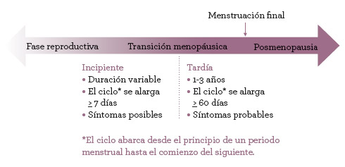 Desde el punto de vista médico, la transición menopáusica se divide en dos fases: incipiente y tardía (ver figura 5). La diferencia principal entre estas dos fases viene determinada por los cambios en la duración del ciclo menstrual, es decir, el retraso entre una menstruación y la siguiente. Durante la fase incipiente, es probable que algunos de los ciclos se alarguen siete días o más o incluso que se produzca una falta completa. La transición tardía se caracteriza por más faltas, a saber, sesenta días entre menstruaciones. Cuando una mujer experimenta dos faltas seguidas, hay un 95 por ciento de posibilidades de que la menstruación llegue a su fin en los cuatro años siguientes. Los síntomas como los sofocos o el insomnio a menudo comienzan en la fase tardía, pero no se trata de una norma fija; algunas mujeres empiezan a experimentar síntomas en la primera fase mientras que otras están cerca de su último periodo, después de tres o cuatro faltas seguidas, y no han tenido ningún síntoma.