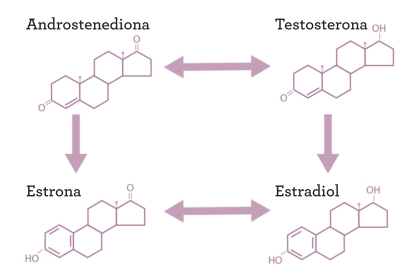 • ESTRONA: un estrógeno más débil que el estradiol. Al igual que este, se fabrica también en el folículo en desarrollo, así como en otros tejidos. La estrona se puede convertir en estradiol y el estradiol, en estrona. Este flujo bilateral se produce en el interior de las células y permite hacer ajustes a nivel celular. Después de la menopausia, la caída de producción de estradiol es más importante que la de estrona.