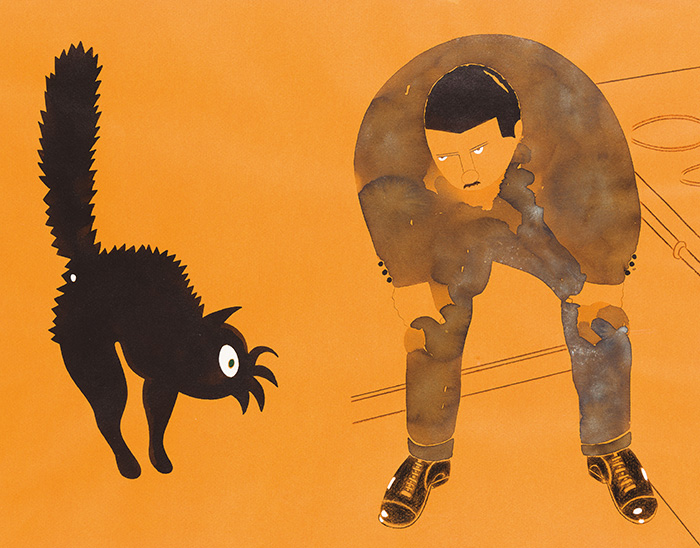 Se sentía pesado, lleno: luego un suave aflojarse de sus intestinos. Se paró, desabrochando la pretina de sus pantalones. La gata le maulló.