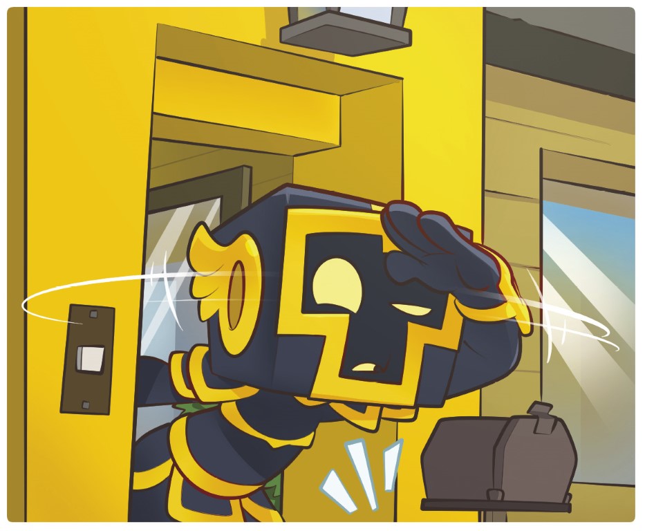 Y el pequeñín lo ha intentado. Enseguida, se ha puesto en marcha meneando sus caderitas hacia el interior de la casa. ¡Y por poco lo consigue! Pero justo, al final, se ha tropezado con su propia ropa. Y, ¡PUMBA!, se la ha pegado contra la puerta.