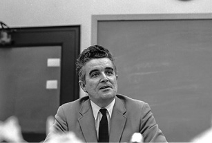 Girard en la apertura de su seminario que sentaría las bases de su libro La violencia y lo sagrado, en la primavera de 1971. |