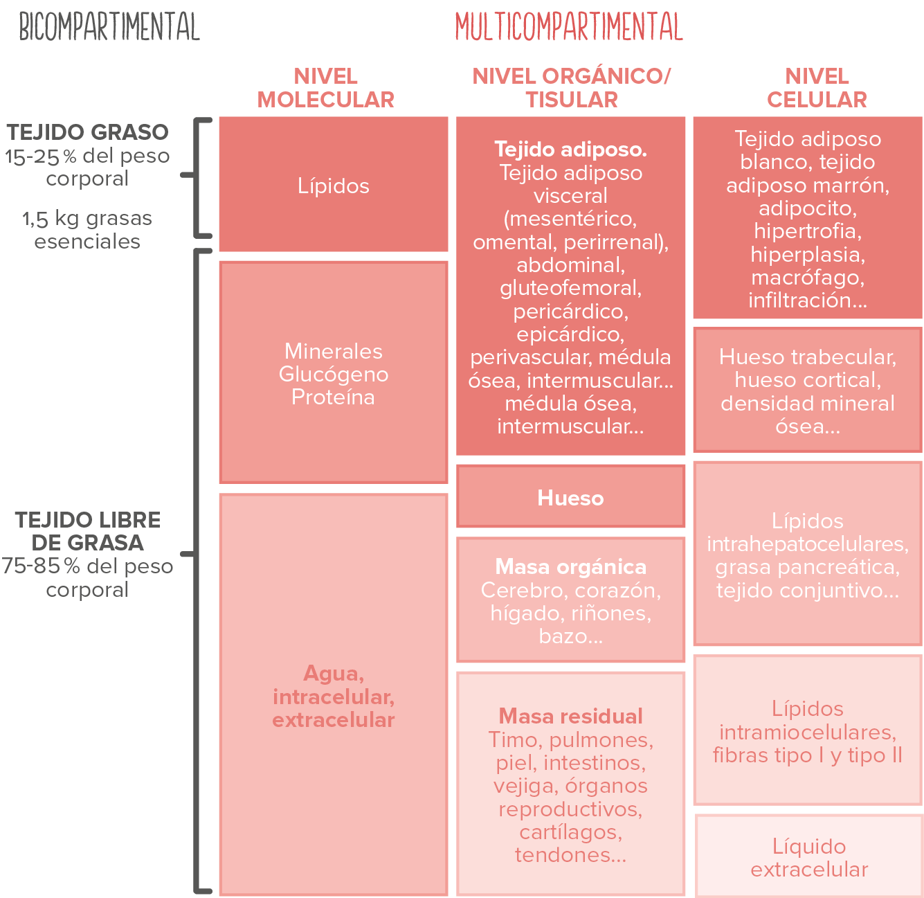 En el estudio de la composición corporal existen varios modelos que nos muestran cómo se dividen los distintos compartimentos corporales. El más práctico es el bicompartimental.9 Básicamente, este modelo divide nuestro cuerpo en dos compartimentos: el tejido graso y el tejido libre de grasa, tal y como muestra el siguiente gráfico.
