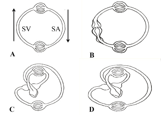 Figura 1. Filogenia del sistema circulatorio. SV: segmento venoso. SA: segmento arterial. Las flechas señalan el sentido de la circulación. A: gusanos. B: peces; se puede observar las tres dilataciones del segmento venoso (seno venoso, aurícula y ventrículo). C: anfibios y reptiles: se inicia, en el segmento arterial, el bucle que dará origen a ambos ventrículos y que se completa definitivamente en D (aves y mamíferos).
