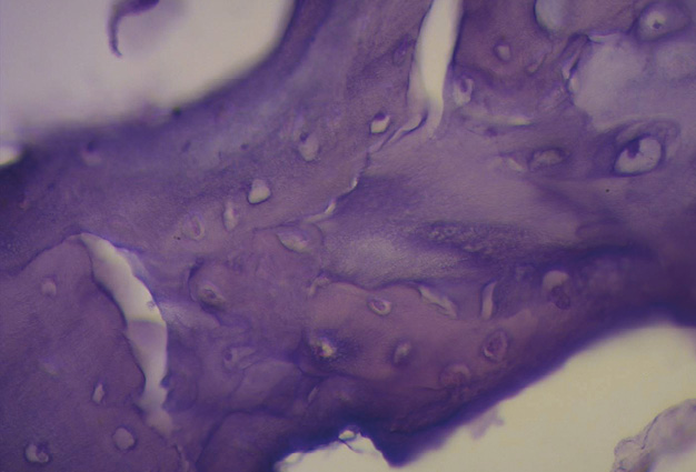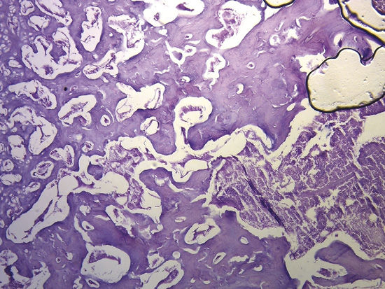 Figura 37. Técnica de hematoxilina-eosina (10x). Trabécula ósea madura que configura el tejido del fulcro cardíaco (corazón bovino).