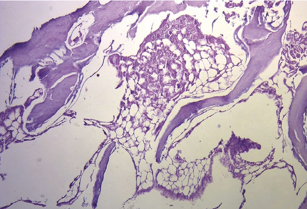 Figura 38. Tinción con hematoxilina-eosina a gran aumento (40x) del fulcro cardíaco. Se observa una trabécula ósea con osteoblastos y líneas segmentarias. La estructura forma el andamiaje del tejido óseo trabecular similar a las zonas metafisiarias de crecimiento de los huesos largos. Se visualizan trabéculas óseas con osteoblastos y líneas segmentarias secundarias a aposición ósea (corazón bovino).