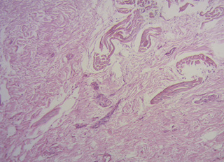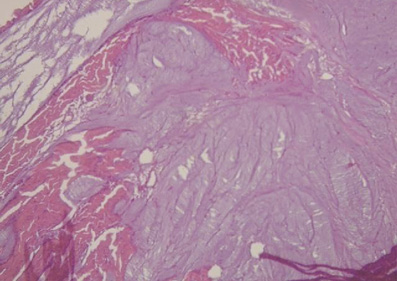 Figura 57. Trígonos. Se observa tejido colágeno festoneado y tejido intersticial elastoideo. No se halla inclusión de miocardiocitos. Técnica de hematoxilina-eosina (15x).