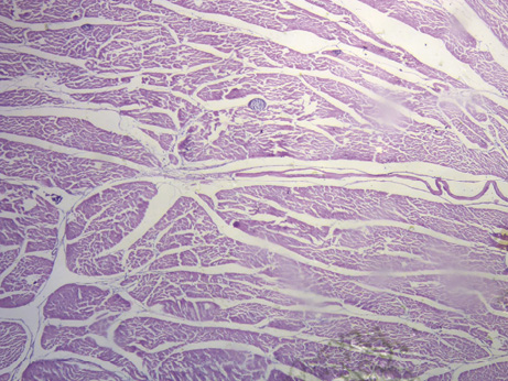 Figura 42. En corazón de bóvido se observa, en medio del fulcro, miocardiocitos del segmento derecho. Técnica de hematoxilina-eosina (40x).