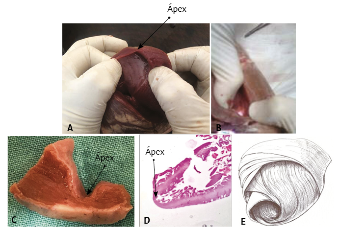 Figura 13. A: se observa el ápex cardíaco. B: la transiluminación positiva en el fondo de saco apexiano demuestra que prácticamente no hay fibras musculares en esta región. C y D: detalle macro y microscópico del ápex que muestra el endocardio adosado al epicardio, casi sin capa muscular, la cual presenta un espesor del 10% con relación al miocardio contiguo. E: el dibujo del miocardio continuo plegado en hélix revela la naturaleza del ápex, el que queda conformado por una zona frágil dado el cambio de orientación del segmento descendente transformándose en ascendente. A y B: corazón bovino. C: corazón humano adulto. D: embrión humano de 16 semanas.
