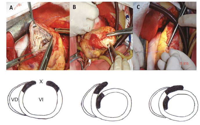 Figura 14. Reconstrucción ventricular epipsoidal. A: incisión longitudinal (X) a lo largo de la arteria descendente anterior en la pared avascular del ventrículo izquierdo (VI). B: el borde izquierdo de la incisión, mediante una sutura continua, es llevado a la pared septal. El borde marginal remanente es suturado constituyendo una solapa a la pared libre del VI. C: la incisión original y el tamaño de las solapas deben obedecer a la dilatación del VI (a la cavidad que se desea conservar) con el fin de reducir los volúmenes ventriculares aumentados. Referencia VD: ventrículo derecho.