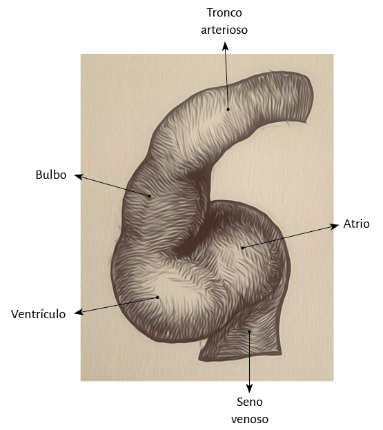 En la evolución hacia los peces se observa la aparición, en el hemicírculo venoso, de un corazón primitivo constituido por tres dilataciones denominadas seno venoso, aurícula y ventrículo, ubicadas en forma consecutiva. Si bien el circuito continúa siendo único, se produce la aparición de una cámara impulsora (ventrículo) con posibilidad de incrementar las presiones intravasculares (figura 1 B).