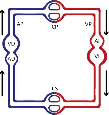 Figura 3. Sistema circulatorio de los mamíferos. AP: arteria pulmonar; CP: capilares pulmonares; VP: vena pulmonar; VD: ventrículo derecho; VI: ventrículo izquierdo; AD: aurícula derecha; AI: aurícula izquierda; CS: capilares sistémicos.