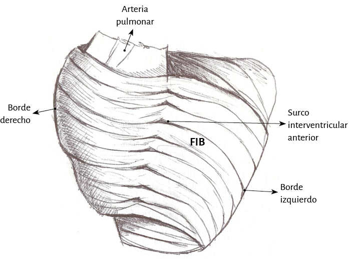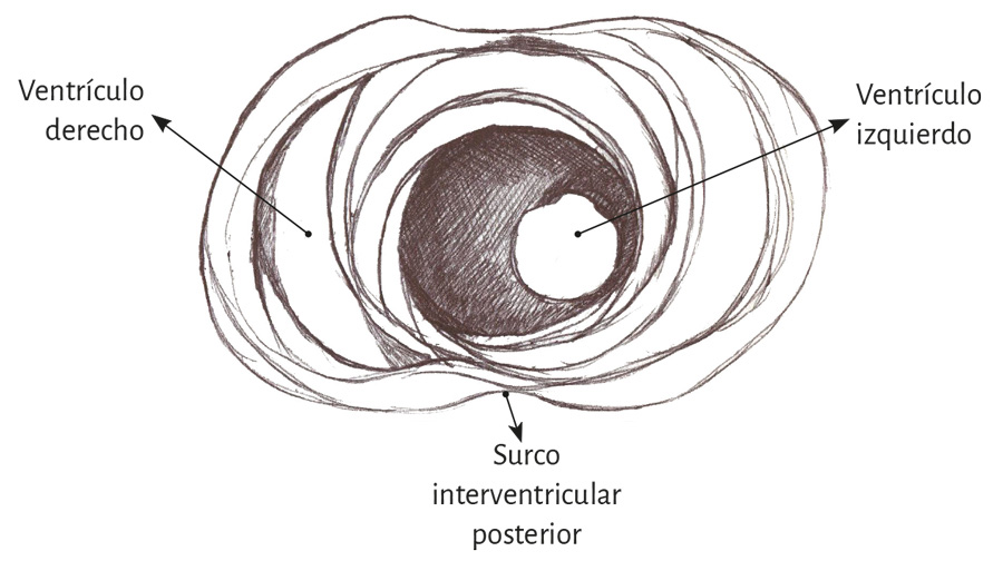 Ventrículo derecho. Mientras que el ventrículo izquierdo posee una conformación elipsoidal, el derecho ofrece una topografía en semiluna (figura 4) (66). Se pueden distinguir en su mitad distal en forma conceptual dos tipos de fibras de acuerdo con la orientación. Unas son paraendocárdicas y las otras paraepicárdicas pertenecientes al segmento derecho del miocardio continuo. Las primeras desde la base pulmonar van hacia atrás y abajo a la región de la punta, mientras que las otras se desplazan desde el surco interventricular anterior hacia atrás, acercándose a la base cardíaca. Esta disposición cruzada en equis permite ver en la parte distal del ventrículo derecho que las fibras toman una disposición helicoidal, transformándose de este modo de subepicárdicas en subendocárdicas (figura 16).