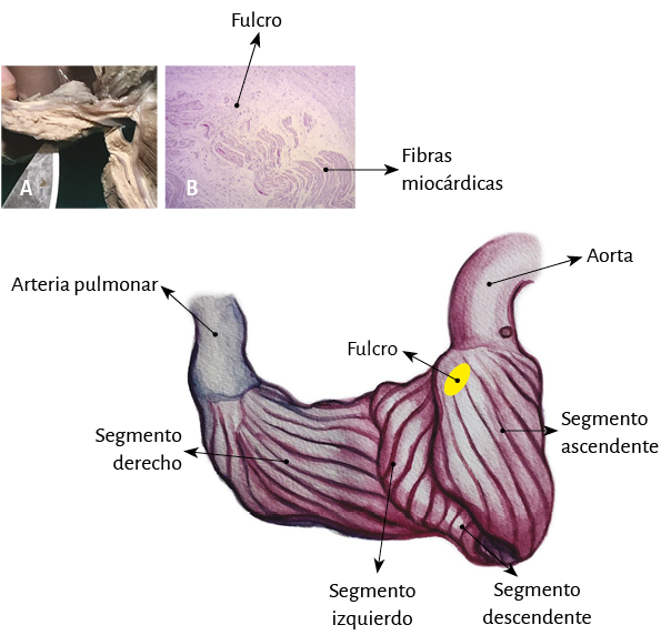 Figura 21. Se observa en este dibujo la disposición del miocardio continuo al inicio de ser desplegado. Es necesario considerar que la arteria pulmonar y el segmento derecho se han separado del fulcro cardíaco con el fin de señalar la ubicación intermedia de este entre el segmento derecho (ubicación anterior) y el segmento ascendente (ubicación posterior). A: macroscopía del fulcro en corazón humano adulto. B: microscopía del fulcro humano. Adviértanse las fibras miocárdicas insertándose en la matriz tendinosa del fulcro.
