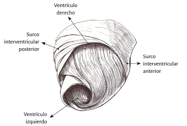 Lazada basal. El surco interventricular posterior ofrece un valle que determina el límite entre los segmentos derecho e izquierdo de la lazada basal. El segmento derecho constituye la pared libre del ventrículo derecho y contornea por fuera el orificio de la válvula tricúspide. El segmento izquierdo ubicado en la pared libre del ventrículo izquierdo define por fuera el orificio de la válvula mitral. Las fibras transcurren en una dirección que va desde el subepicardio al subendocardio siguiendo una trayectoria helicoidal contraria al sentido de las agujas de un reloj (corazón en su posición anatómica, sobre su cara diafragmática, visto de frente por el ápex).