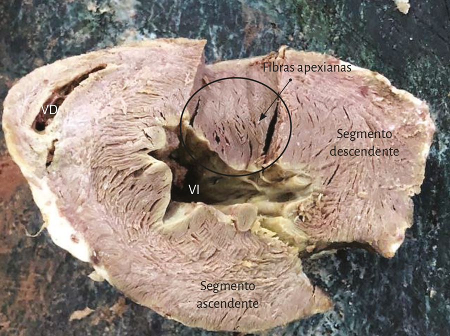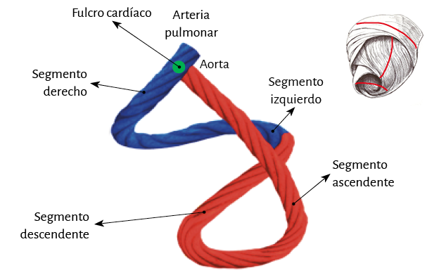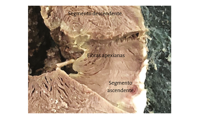 Lazada apexiana. El segmento descendente se extiende desde el doblez del miocardio continuo hasta el ápex. Desde ahí, toma la denominación de segmento ascendente para finalizar fundamentalmente por debajo de la base de la aorta en una estructura en la que se amarran las fibras y que hemos denominado fulcro cardíaco. Estos segmentos constituyen mayoritariamente el tabique interventricular. Igualmente a lo que sucede en la lazada basal, las fibras discurren desde el subepicardio al subendocardio, pero en este caso siguiendo una trayectoria helicoidal en sentido horario al desplazamiento de un reloj (corazón en su posición anatómica, sobre su cara diafragmática, visto de frente por el ápex).