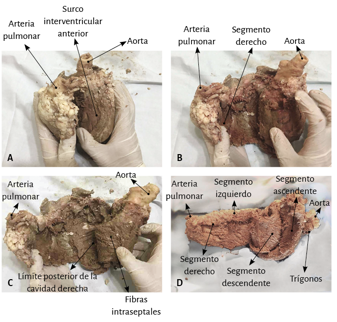 La prosecución en la disección del miocardio implica encontrarse con toda la extensión del segmento derecho, el inicio del segmento izquierdo, y en el límite posterior de la cavidad ventricular derecha, con el ángulo diedro constituido por el septum interventricular y la pared libre del ventrículo derecho (segmento derecho) (figuras 24 A y B). El próximo paso (el más delicado) consiste en posicionarse en el ángulo diedro mencionado anteriormente, entre las fibras del ventrículo derecho y las intraseptales. Esta separación del ventrículo derecho permite ingresar en la parte ventral del tabique (figura 24 C). Luego se diseca la parte dorsal del tabique entre la banda septal posterior (ventrículo derecho) y el segmento descendente para desmontar y separar la aorta.