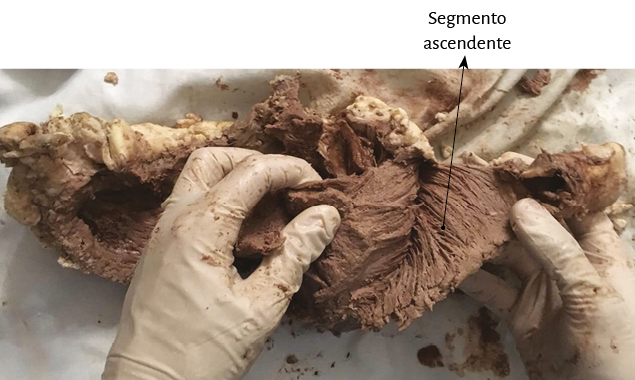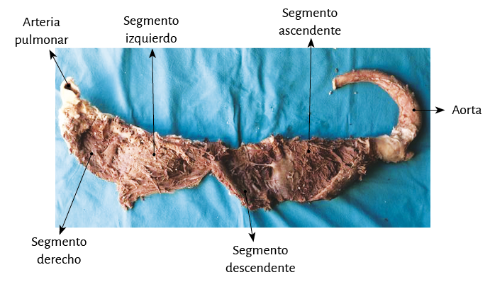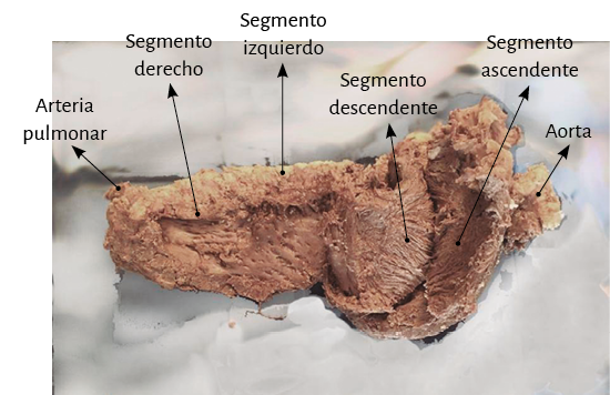 Figura 32. Se aprecia el segmento ascendente, el que se va a insertar en el fulcro cardíaco (corazón bovino).