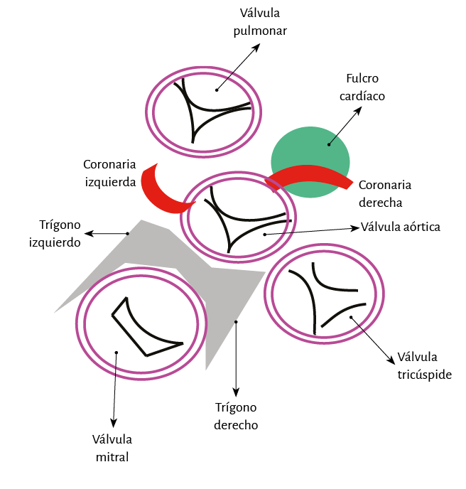 Como se observa en la figura 71, el anillo aórtico no es continuo. En un sector de su circunferencia, ubicado entre los extremos de los trígonos, se halla interrumpido y es aquí donde se inserta la valva anterior de la válvula mitral. El cordón pulmotricuspídeo se halla ubicado por delante de una zona que rodea los dos tercios anteriores de la circunferencia del anillo aórtico en forma de U, cuyo extremo abierto (posterior) está ocupado por la valva anterior de la mitral. En sus extremos este tejido tiene dos trígonos. El trígono fibroso derecho (cuerpo fibroso central) es el más prominente y se localiza entre los orificios tricúspide (derecha), aórtico (posterior) y cordón pulmotricuspídeo (anterior). El izquierdo, menos prominente, se ubica entre el orificio mitral (izquierda) y la aorta. En la continuidad del orificio aórtico con la valva posterior de la mitral no hay tejido conectivo, ya que lateralmente los dos cuerpos fibrosos se continúan por una banda conjuntiva que rodea el orificio de la válvula mitral parcialmente para luego desvanecerse progresivamente. La valva septal de la mitral se halla ubicada entre ambos trígonos como una cuña y puede ser considerada una extensión del endocardio auricular.