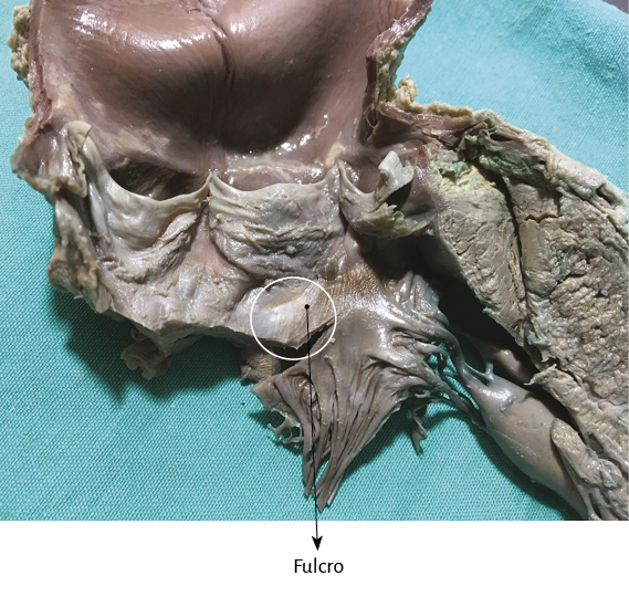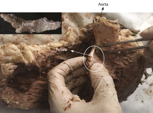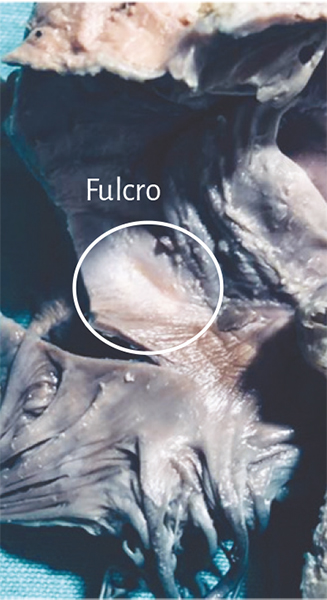 Nuestras investigaciones han demostrado, en el trayecto del segmento septal del anillo aórtico que se extiende desde el trígono izquierdo al derecho, la presencia de un núcleo sólido que hemos denominado fulcro cardíaco (por debajo del origen de la arteria coronaria derecha), donde se amarra el miocardio continuo en su inicio y al final, que como todo músculo necesita un apoyo para cumplir con su función.