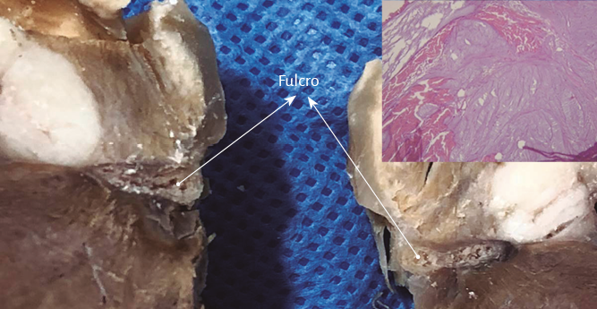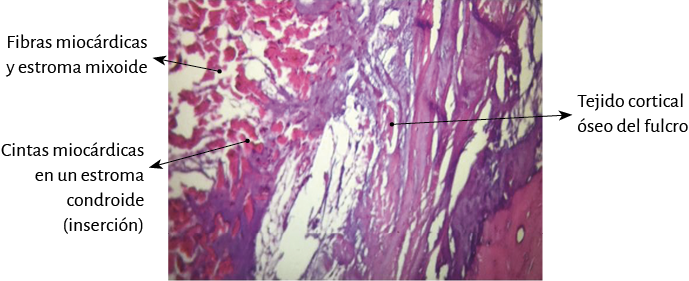 Análisis histológico del fulcro cardíaco. En las investigaciones anatómicas hemos hallado en todos los corazones de bóvidos y de humanos un núcleo cuya estructura histológica es diferente de acuerdo con los especímenes analizados, presentándose como de carácter óseo, condroide o tendinoso. En esta estructura se amarran tanto las fibras musculares del segmento derecho (inserción inicial) como las del segmento ascendente (inserción final). Durante la disección del miocardio, el hallazgo en esta investigación del fulcro cardíaco como núcleo donde se inserta el miocardio nos condujo a otras indagaciones: ¿cuáles eran sus características?, ¿qué ubicación ostenta?, ¿cuál es la histología?, ¿es análoga su presencia en distintas especies?, ¿cómo se inserta el músculo miocárdico en dicha estructura que hemos denominado fulcro cardíaco?