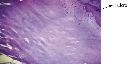 De modo tal que el análisis histológico del fulcro en corazones humanos adultos evidenció una matriz colágena de naturaleza tendinosa, lo cual determina la necesidad de una elucidación adicional. El haberse hallado en humanos y diferentes especies implica que desde el punto de vista funcional su presencia es sinónimo de la inserción del miocardio, hecho que hemos corroborado en toda la histología analizada, constituyéndose en un punto sólido de razonamiento para cumplir con su acción biomecánica. Y esta demostración la encontramos cuando dirigimos el análisis histológico al punto de inserción del miocardio con el fulcro cardíaco, sea este óseo, condroideo o tendinoso. En todos los corazones analizados se halló este amarre del miocardio como “la hiedra a la piedra”, en la estructura rígida del fulcro, integrando una unidad miocardiocítica-matriz, aunque esta fuese ósea, cartilaginosa o tendinosa, según los estudios que hemos realizado en esta investigación (figuras 51-56).