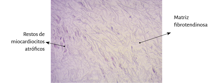 Sin embargo, en el análisis histológico del fulcro en corazones humanos adultos (tamaño aproximado de 25 mm × 15 mm) se encontró una matriz condroide-tendinosa, lo cual necesita una aclaración adicional (figuras 48-50). En principio, existe constancia similar en la detección, localización y morfología del fulcro en todos los corazones analizados. Ellos presentan inserción del miocardio en la estructura rígida del fulcro, integrando una unidad cardiomiocítica-matriz, independientemente de su naturaleza ósea, cartilaginosa o tendinosa en los distintos especímenes estudiados. Este punto de fijación implica que, como en todo músculo, actúe de palanca y también en carácter de cojinete, impidiendo además que en esta situación la fuerza de rotación ventricular, sea por torque o esfuerzo de torsión, se extienda a los grandes vasos, disipando así la energía producida por el movimiento de la hélice muscular.